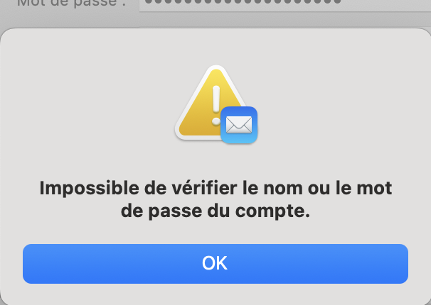 Malgré plusieurs tentatives de configuration, la boîte ne parvient pas à se connecter correctement. J’ai vérifié les paramètres (mot de passe, ports, certificat TLS, etc.) mais rien n’y fait. Apple m’indique que le compte ne peut pas être utilisé, sans plus de détails.