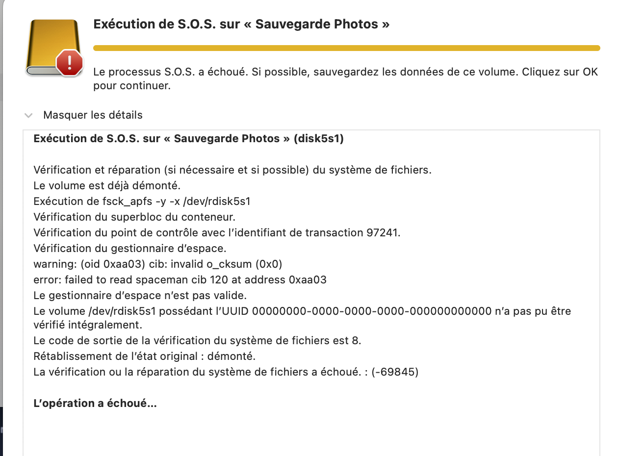 je n'arrive pas à monter le disque dur externe dans l'Utilitaire de disques, voici ce que m'indique l'exécution de SOS. J'ai essayé sur mon MacbookPro plus ancien (Monterey) et j'ai le message d'erreur suivant : "impossible de monter "Sauvegarde photos" (erreur 49218 dans com.apple.DiskManagement.disenter.). Je suis sur Mac Book Air Sonoma 14.6.1