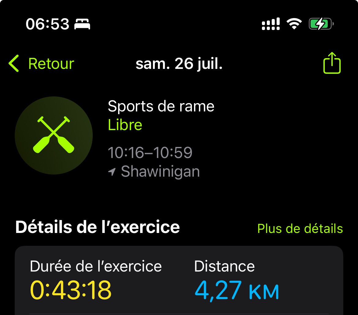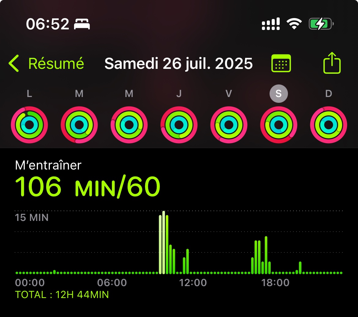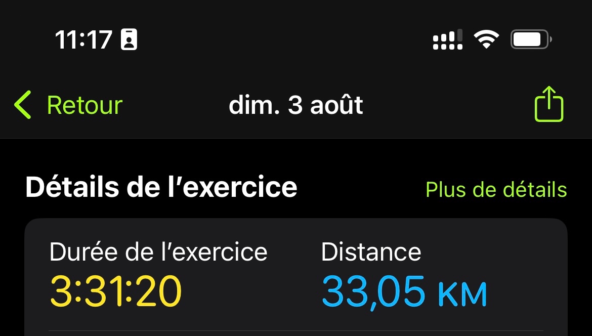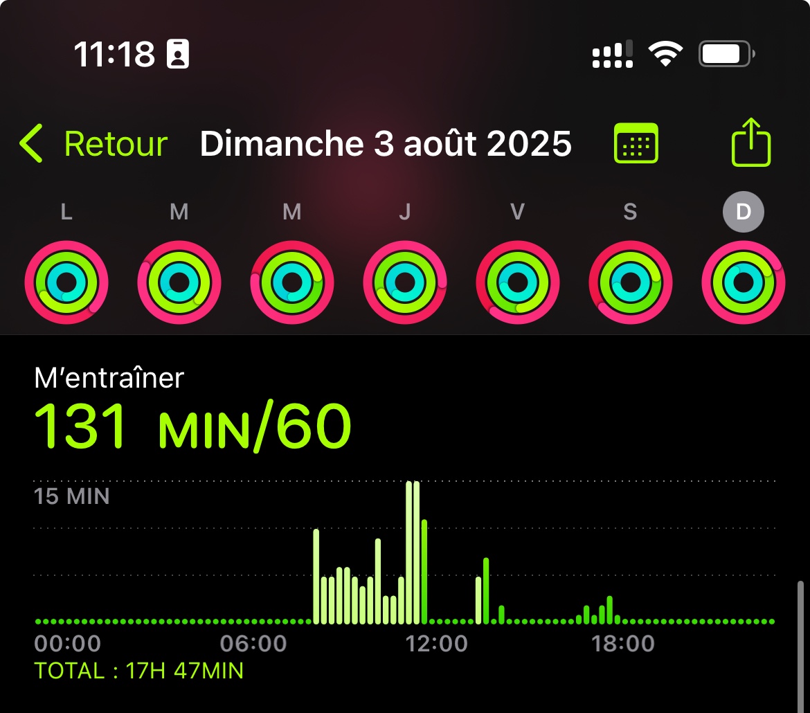 Exemple : le dimanche 3 août passé, mon activité a duré 3h30, mais mon anneau « m’entraîner » s’est rempli à hauteur de 131 minutes seulement.