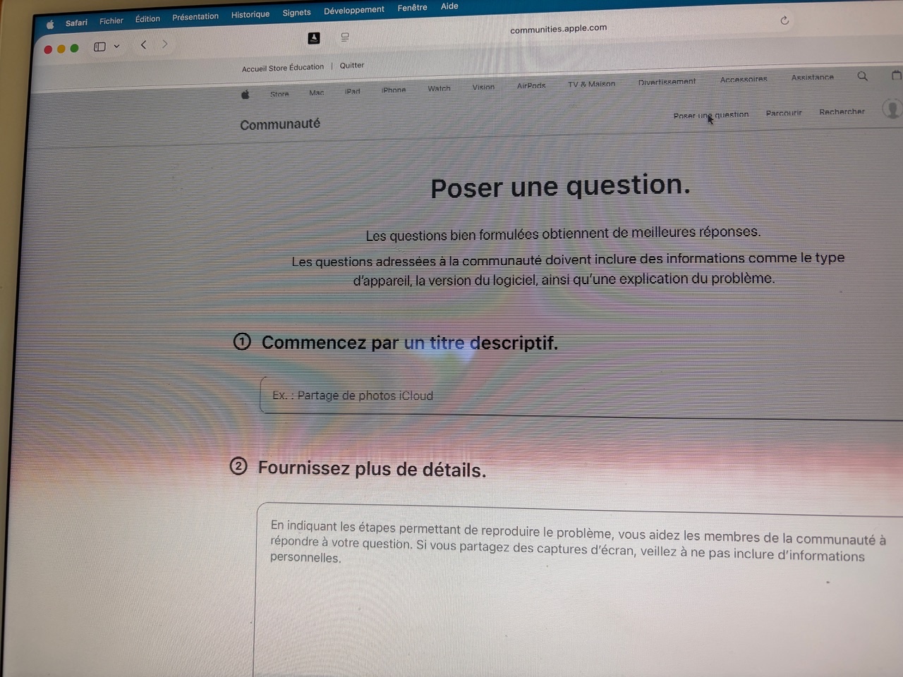 J'ai un probleme d'affichage sur mon iMac M1 8go. En effet, j'ai boul agrandir un plan sur une page safari en maintenant le bouton commande et en utilisant la souris et depuis j'ai la moitié de mon écran qui a des traces noirs, affichage flou et scintillement. J'ai essayé de réinitialiser le SMC et la NVRAM mais cela ne résout rien. Evidemment, j'ai également essayé de redemerrer plusieurs fois mais sans succès. Voici les images.