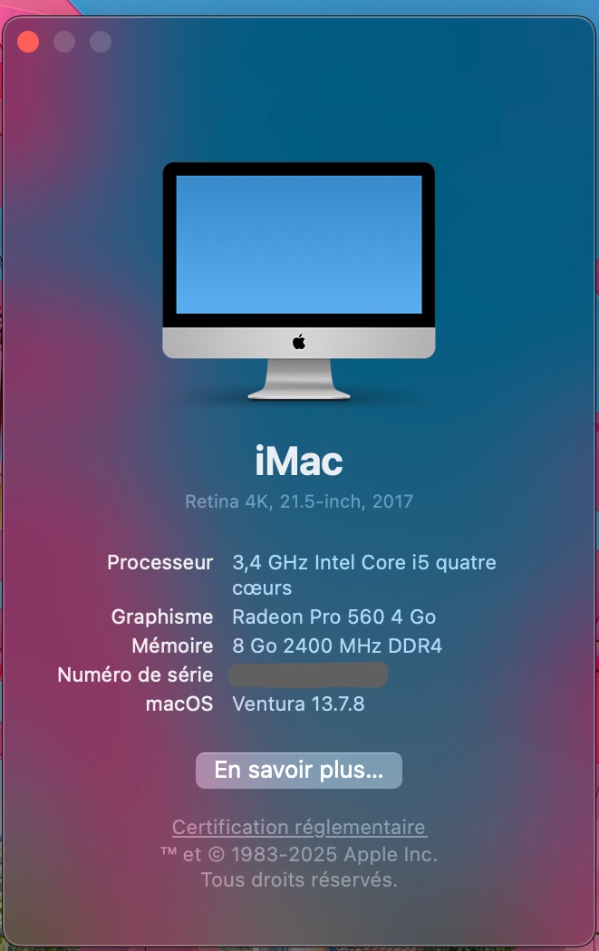 Mon iMac c'est un iMac Retina 4K. logiciel macOS Ventura 13.7.8