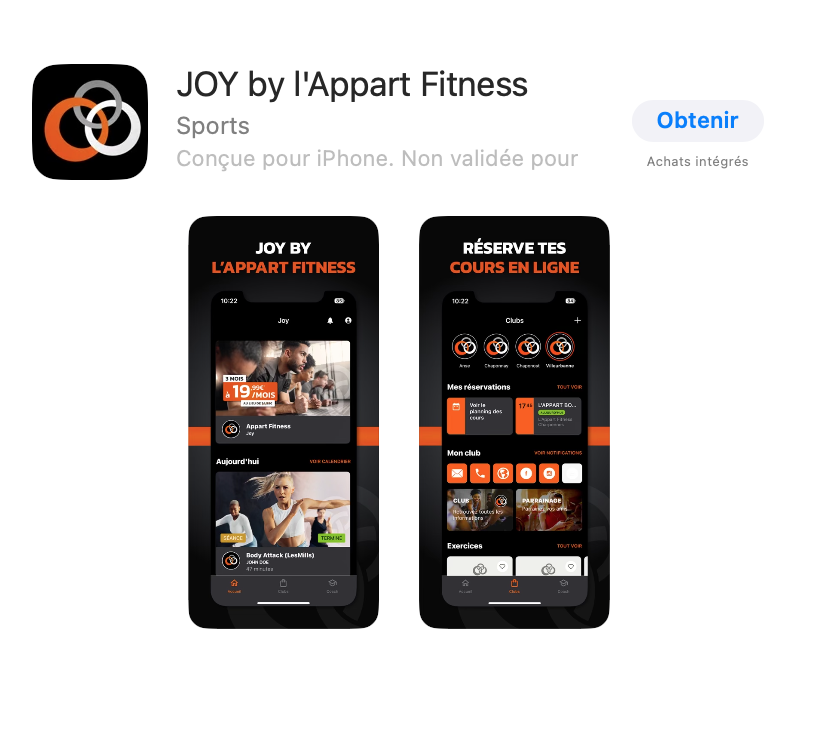 Je me suis inscrite dans une salle de sport qui utilise l’app “Joy by l’appart Fitness”. Malgré mes tentatives pour la télécharger je n’y arrive pas car je ne la trouve même pas sur App Store. En revanche, si j’essaie de la trouver avec un smartphone, elle ressort tout de suite.