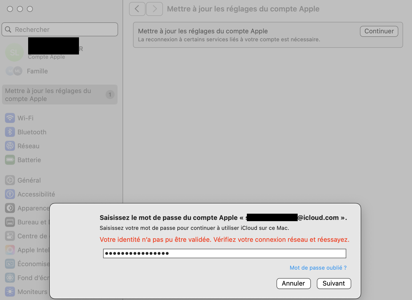 Mon MacBook Air n'arrive plus à mettre à jour les réglages de mon compte apple suite à la dernière mise à jour.