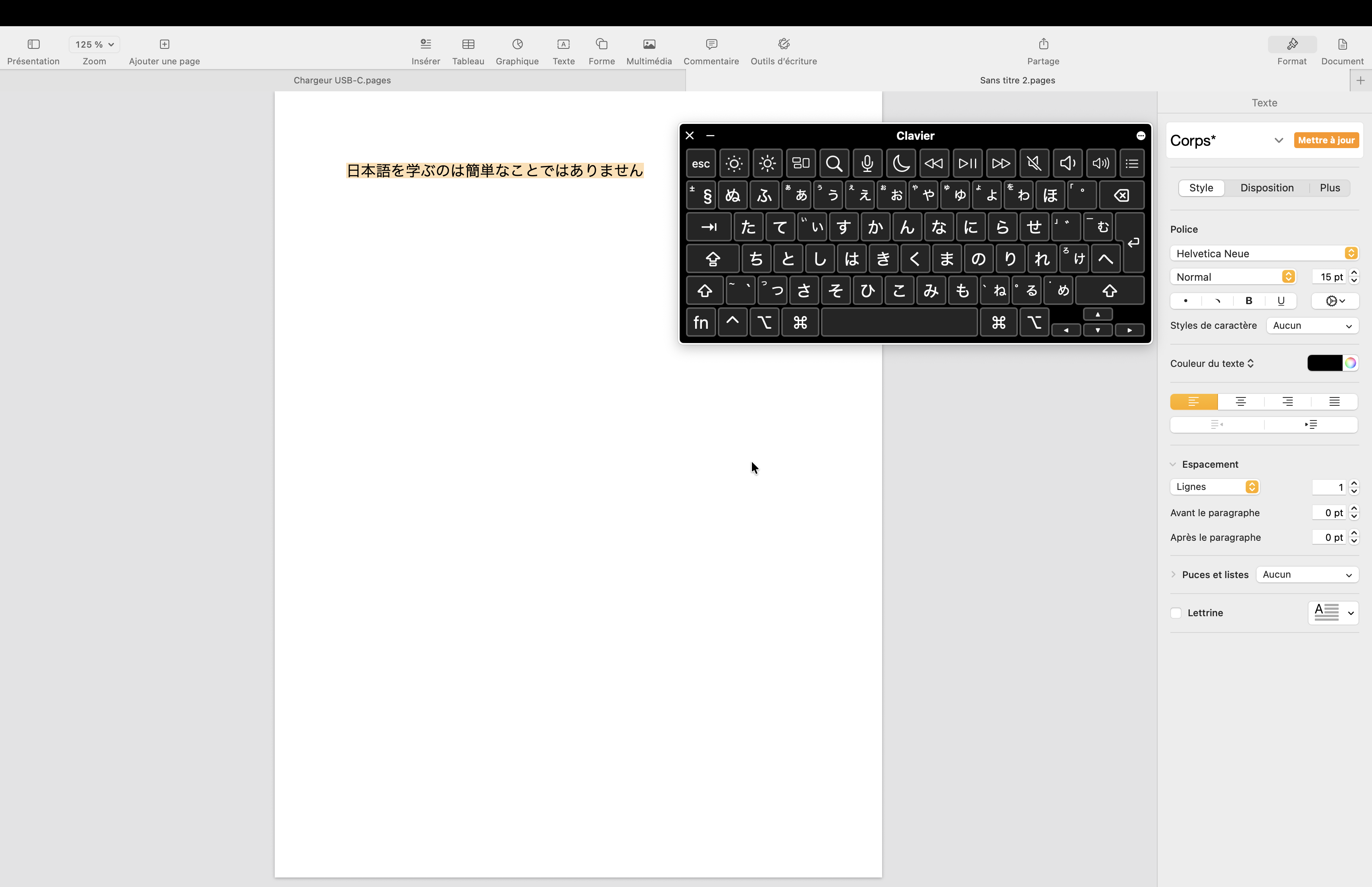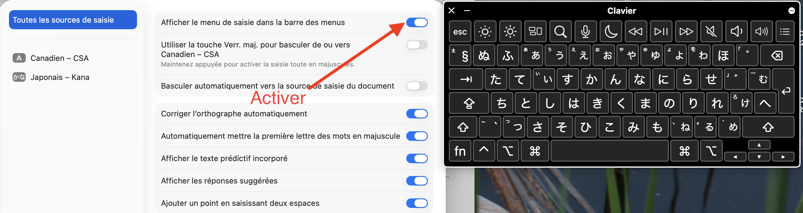 J'aurais besoin d'écrire en japonais en utilisant le clavier azerty français de mon nouvel macbook air M4. J'ai ajouté le japonais comme méthode de saisie mais cela me fait basculer sur le clavier japonais, du coup les touches ne correspondent plus et je suis obligée de visualiser le clavier à l'écran pour me repérer. J'ai vu dans ce forum que quelqu'un avait suggéré de choisir comme méthode de saisie japonais - romaji mais avec cette méthode de saisie quand je tape le texte reste en romaji, donc en lettre occidentales, alors que j'aurais besoin qu'ils soit en kana ou même en kanji. Dans mon ancien Macbook pro cela se faisait automatiquement mais ici ça ne marche pas. Est-ce que quelqu'un pourrait m'aider ?