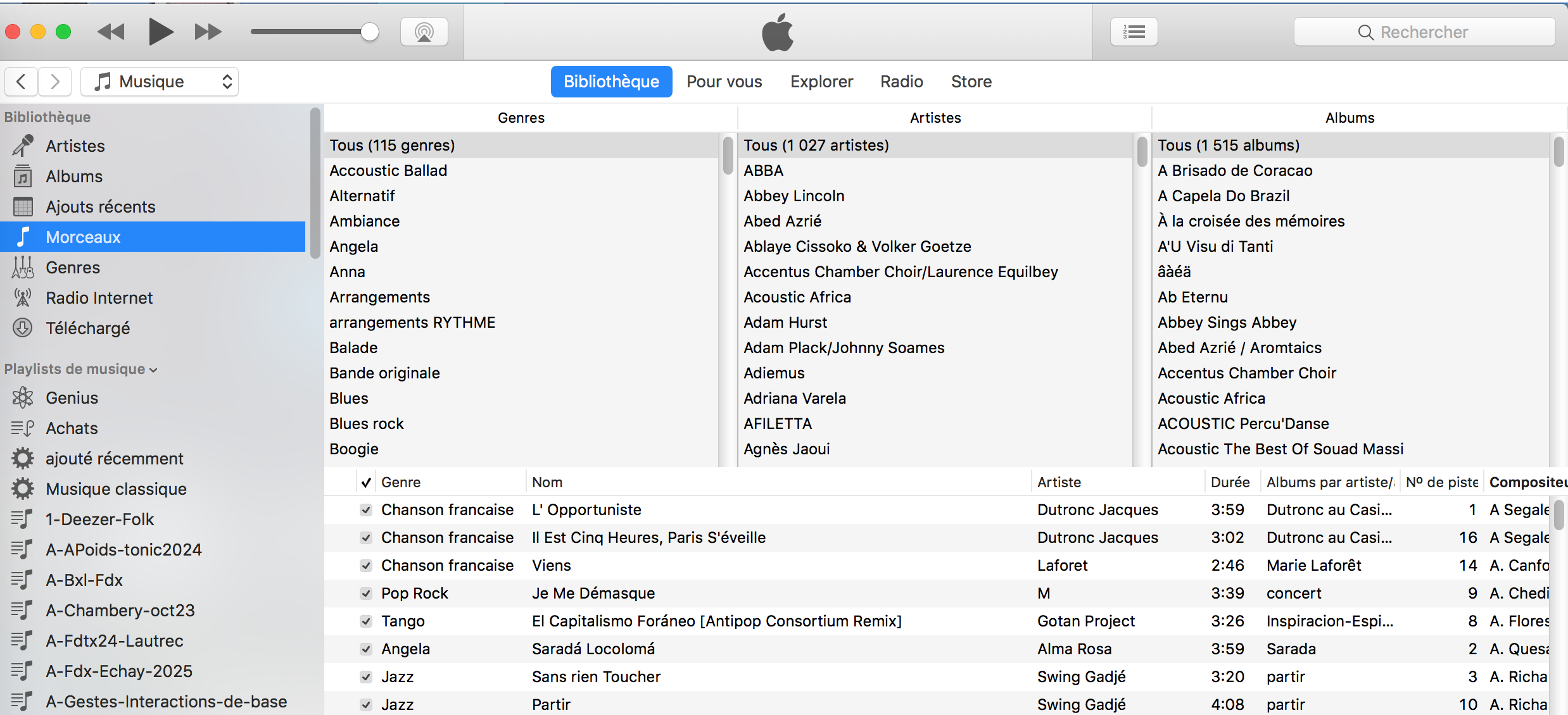 Sur mon précédent mac itune affichait par colonnes de façon très pratique : une colonne Genre une colonne artistes une colonne albums. (pour ce que j'avais choisi) Le détail des titres apparaissait dans une fenêtre en dessous seulement si je sélectionnais qqchose dans l'une des colonnes. Avec le nouveau mac impossible de retrouver cette organisation. Qqun sait-il comment réorganiser tout ça ? Cf capture d'écran