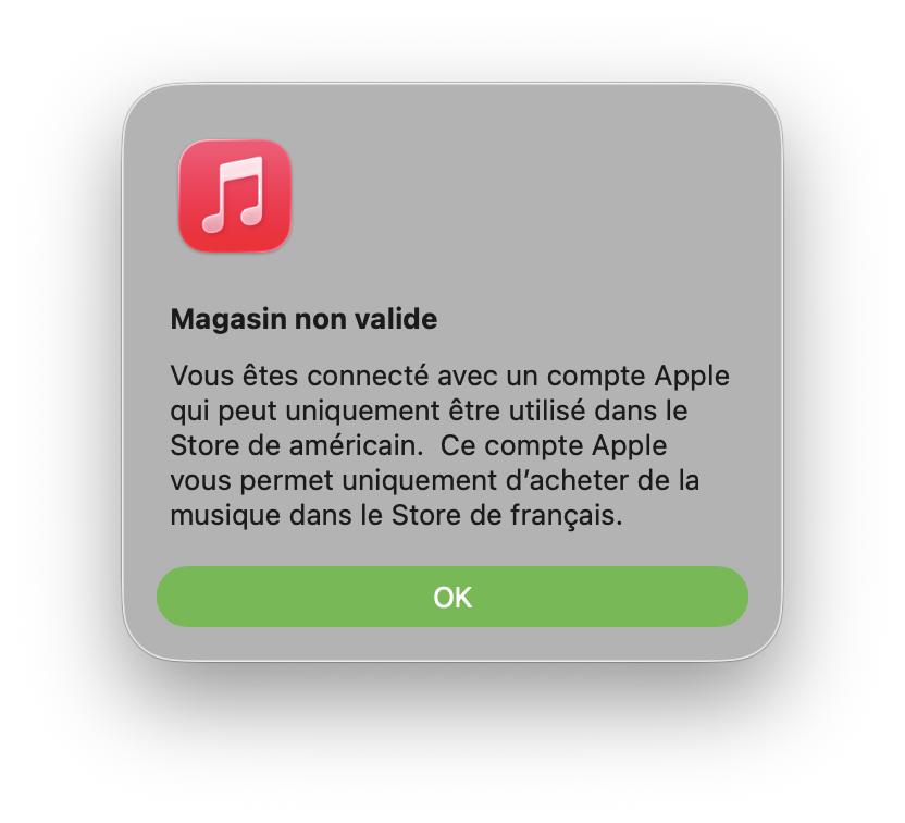 Depuis que je suis revenu en France, je ne peux plus écouter de la musique sur mon Mac alors que sur mon iPhone je n'ai aucun problème. À chaque fois, j'ai ce message-là :
