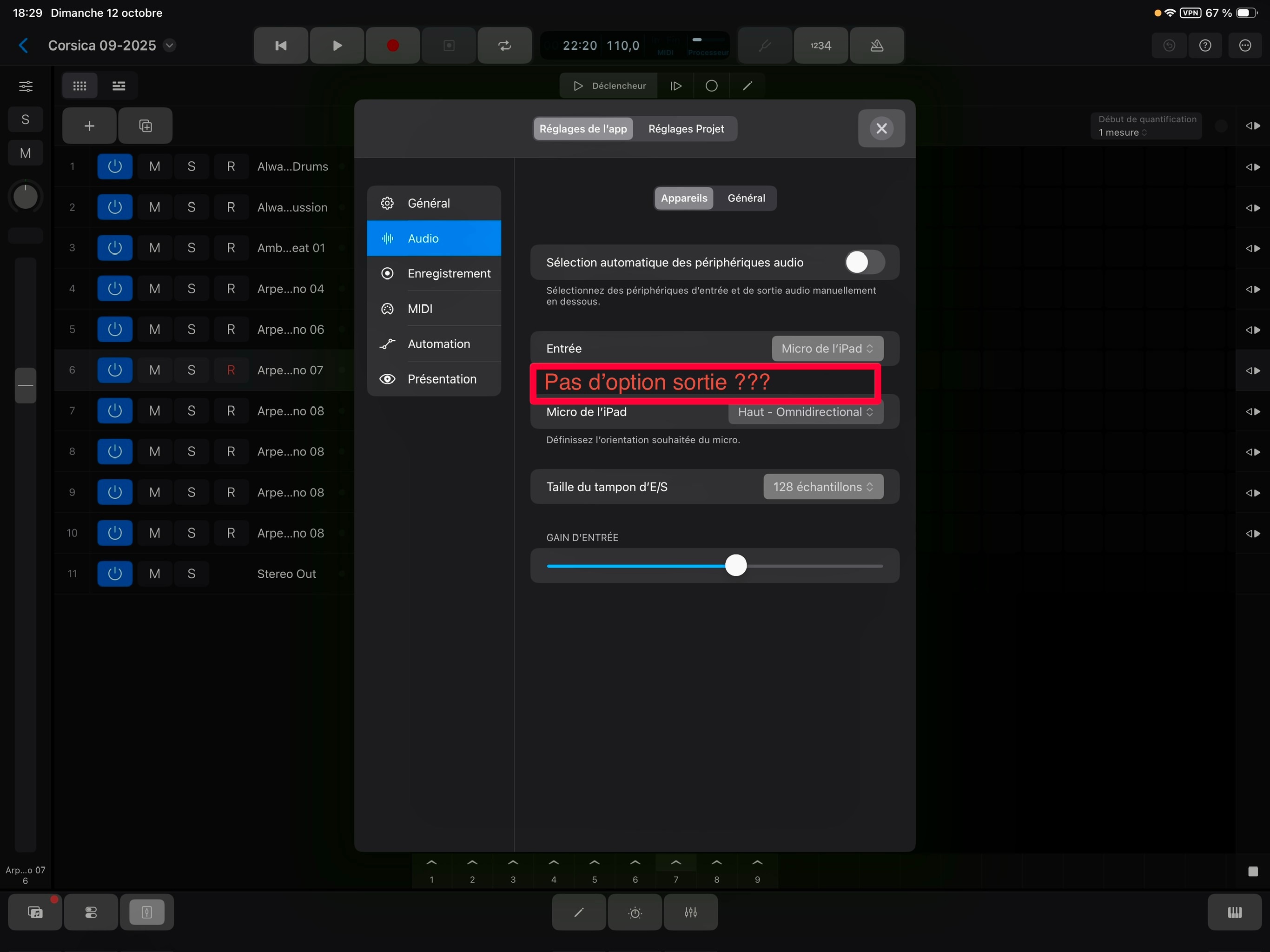 Les explications permettant une sortie audio de l‘appli Logic pro , pour IPad, vers des haut parleurs externes via Air Play, tel que des HOME POD, affiche un onglet qui permet de sélectionner divers choix de HP, sur mon IPad, Logic Pro, n’affiche pas d’onglet « Sortie » ????