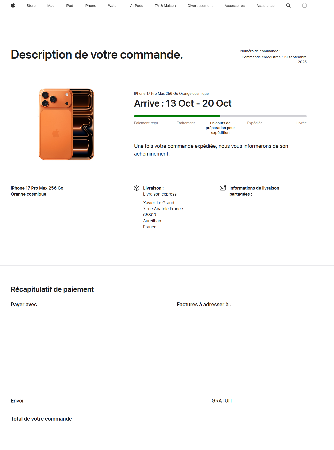 Bonjour la communauté, j'ai passé commande de l'iphone 17 PROX MAX le 19 septembre et estimation de livraison du 13 octobre au 20 octobre. Le suivi a bougé d'un cran c'est-à-dire en cours de préparation pour expédition au bout d'une semaine Début octobre.