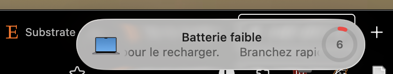 Depuis la mise à jour vers macOS Tahoe 26, la notification de batterie faible apparaît de manière redondante et répétitive à partir du moment ou un passe sous 10%, environ toutes les 20 secondes, et reste affichée sur l’écran pendant 15 secondes. Cela rend l’utilisation de l’ordinateur très inconfortable. Vous trouverez une photo ci-jointe.