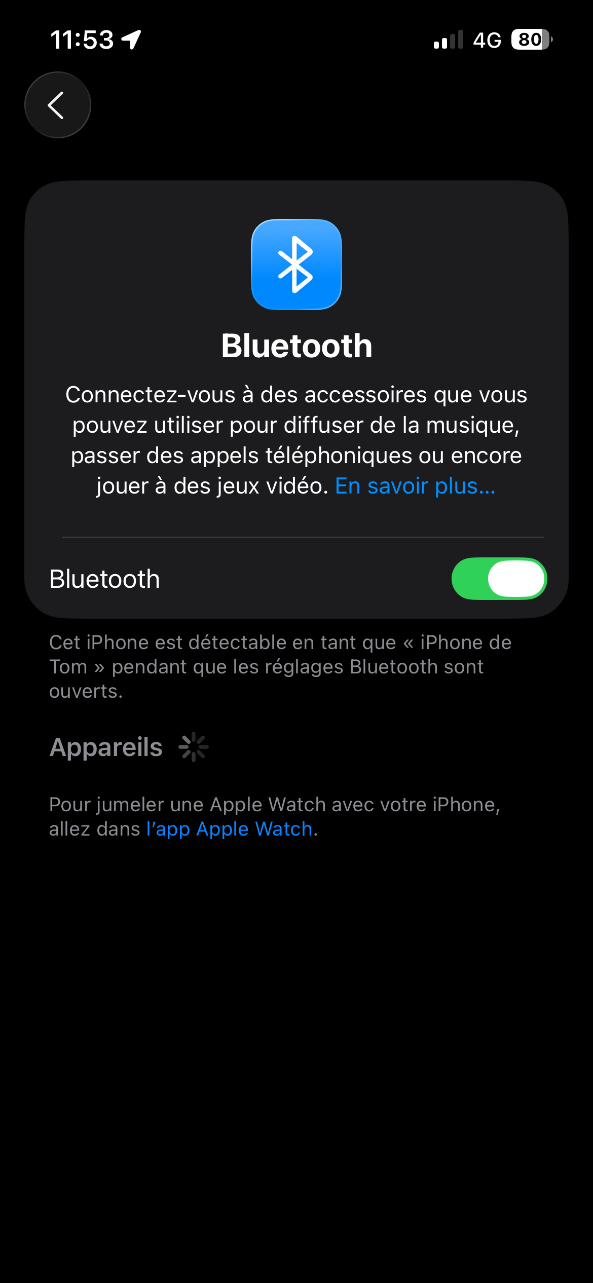quand j’essaye de connecter mon iPhone 14 au Bluetooth de mon casque celui ci ne le reconnais pas depuis que j’ai changé mon téléphone comme ici ou mon casque est activé en Bluetooth mais l’iPhone de le reconnaît pas il est bien chargé et ne fonctionne pas avec de pile