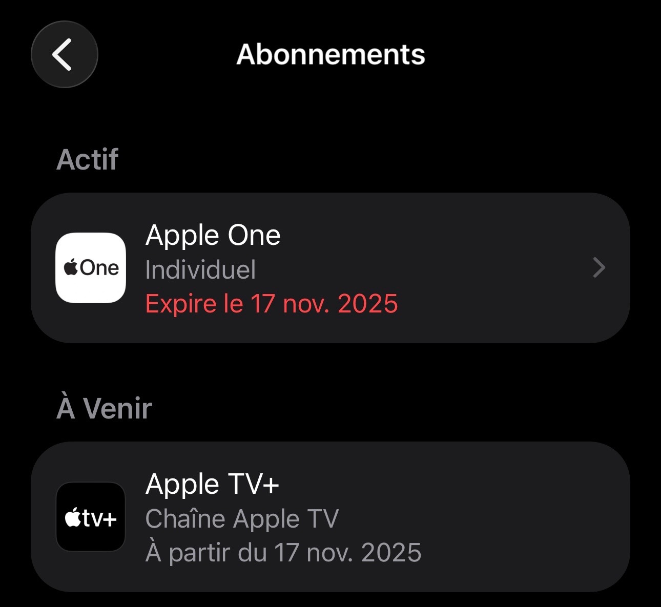 Je suis maintenant bloqué car impossible d'annuler séparément apple tv +, je n'ai pas accès à la résiliation et j'ai marqué sur mes abonnements "À venir, apple tv +" sans pouvoir le résilier. Alors que j'ai bien apple one avec la date d'expiration. À rien n'y comprendre...