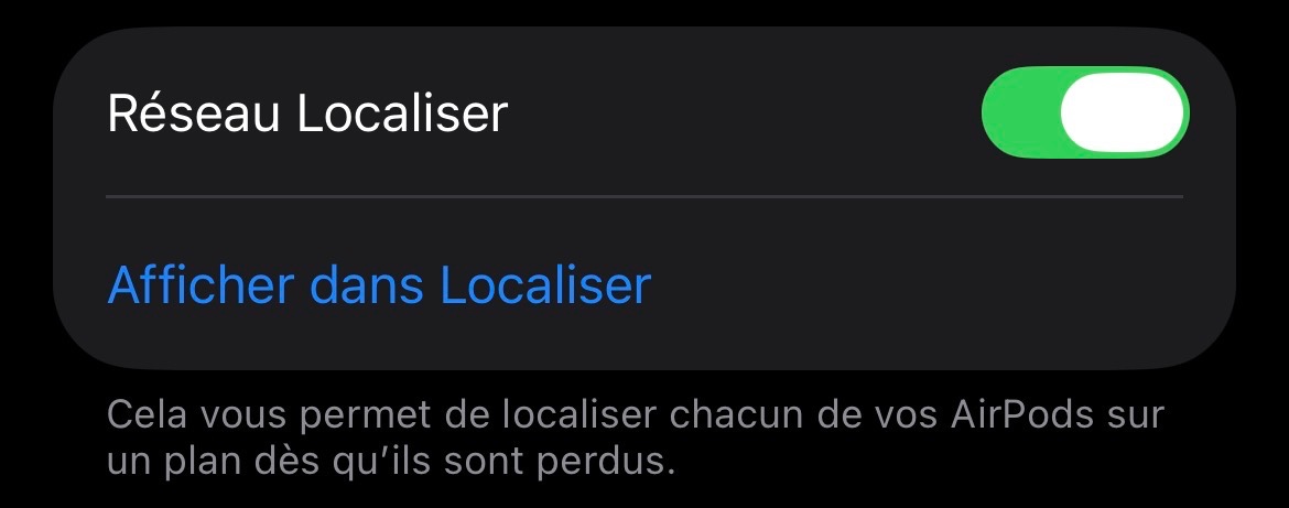 De retour sur mon iPhone, en retournant dans la fenêtre des AirPods, la fonction localiser s’affiche à présent, mais même après l’avoir activé, rien n’apparaît.