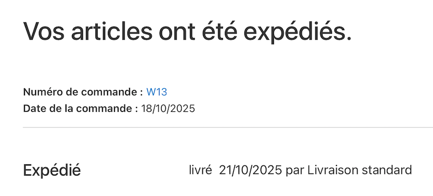 J’ai commandé le 6 octobre 2025 l’iPhone 17 pro via le site (l’Apple Store le plus proche étant à 1h30 de chez moi)