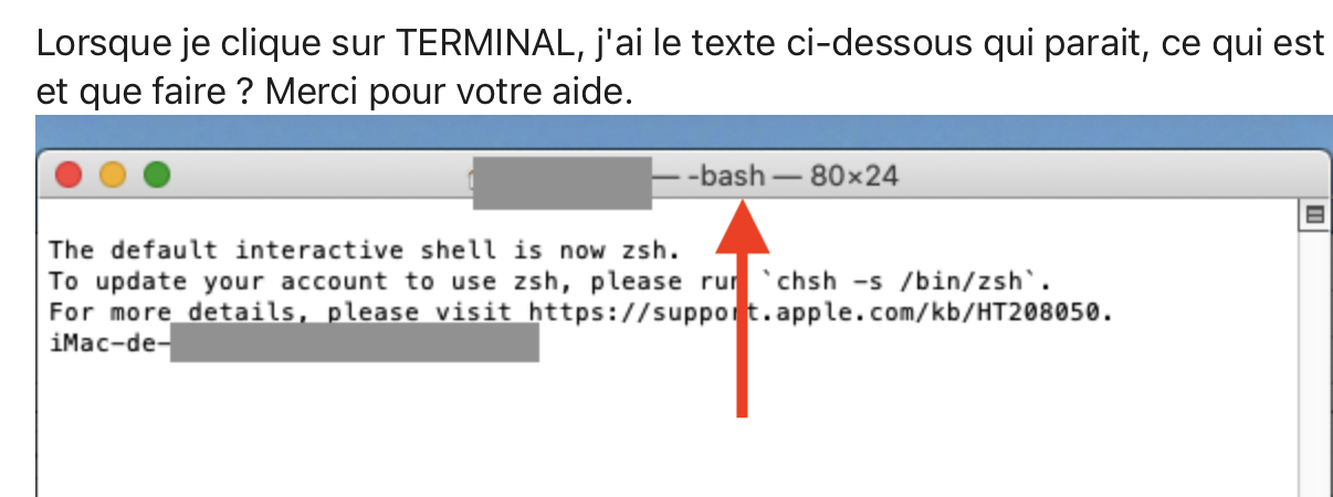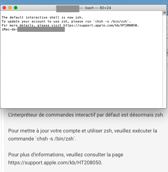 Et la commande qui vous est proposée consiste a mettre a jours les informations de Terminal sur votre compte Apple, soit le set de commandes utilisées par Terminal qui est passé de bash à zsh (ce qui est le set de commandes utilisée par défaut par macOS d'Apple) cela pour pouvoir l'utilisé normalement