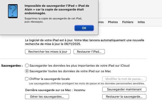 Supprimer sauvegarde iPad endommagée sur Mac