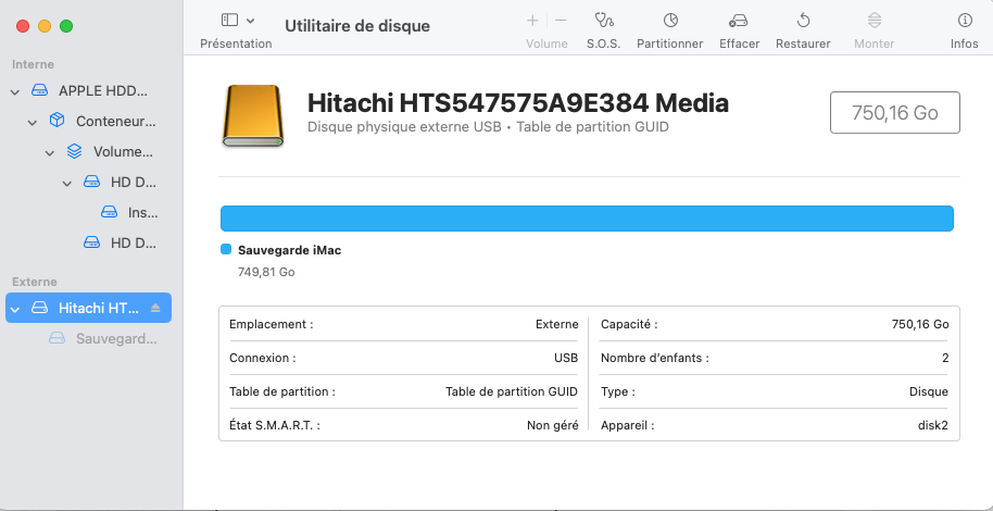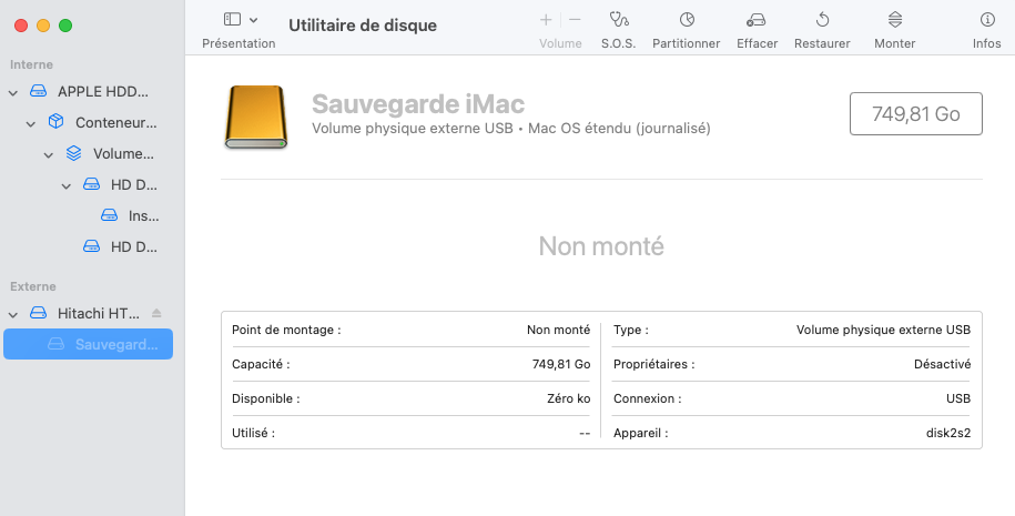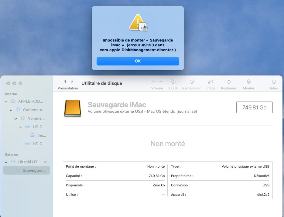Impossible de monter "Sauvegarde iMac" (erreur 49153 dans com.apple. DiskManagement. disenter.)