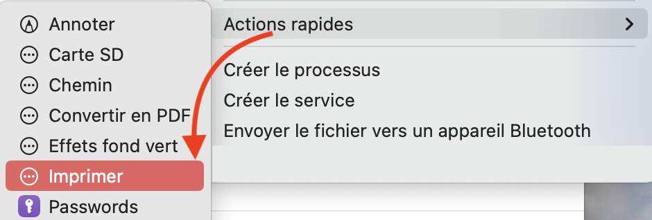 Actuellement j'ai « Coup d’œil », « Renommer », « Dupliquer », « Créer un lien », etc., mais pas Imprimer.