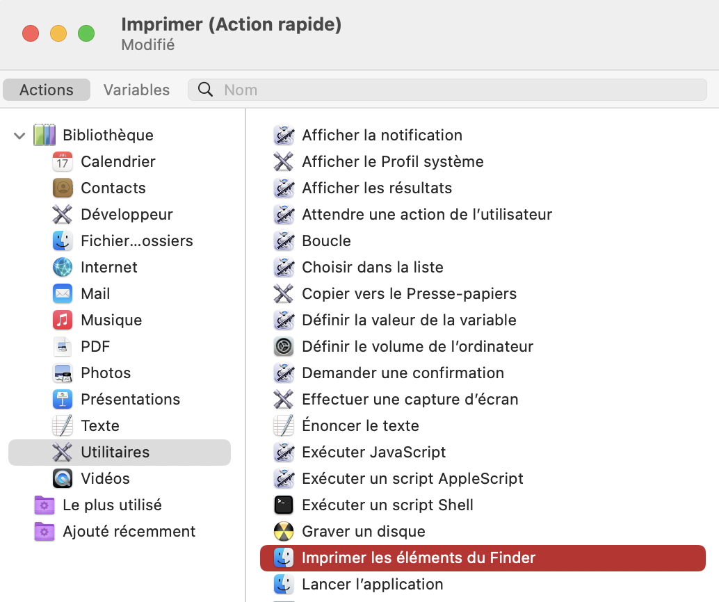 Dans "Utilitaires" sélectionne "Imprimer les éléments du Finder".