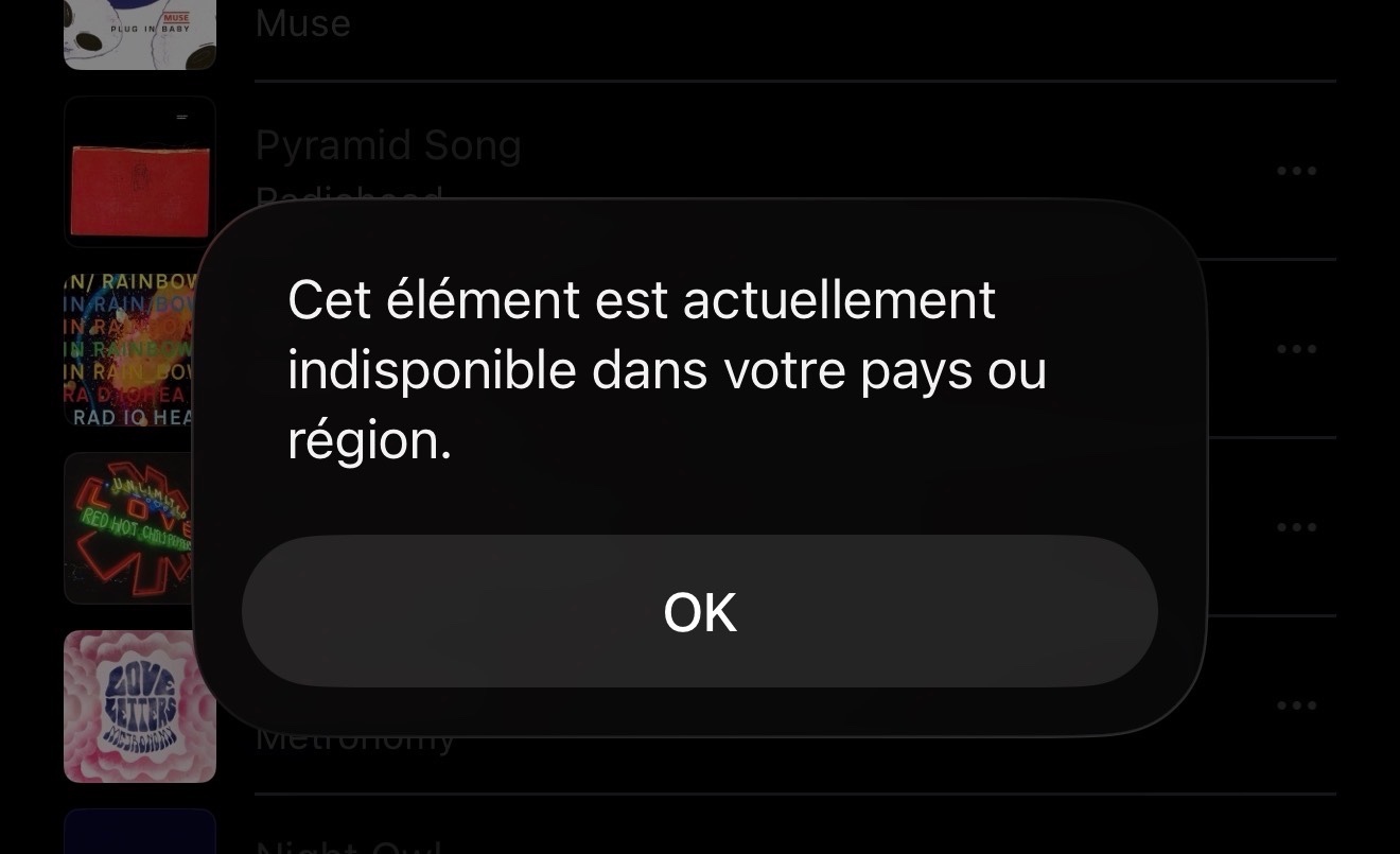 je rencontre des difficultés avec mes playlist, des plages de titres entières sont indisponibles dans mon pays…