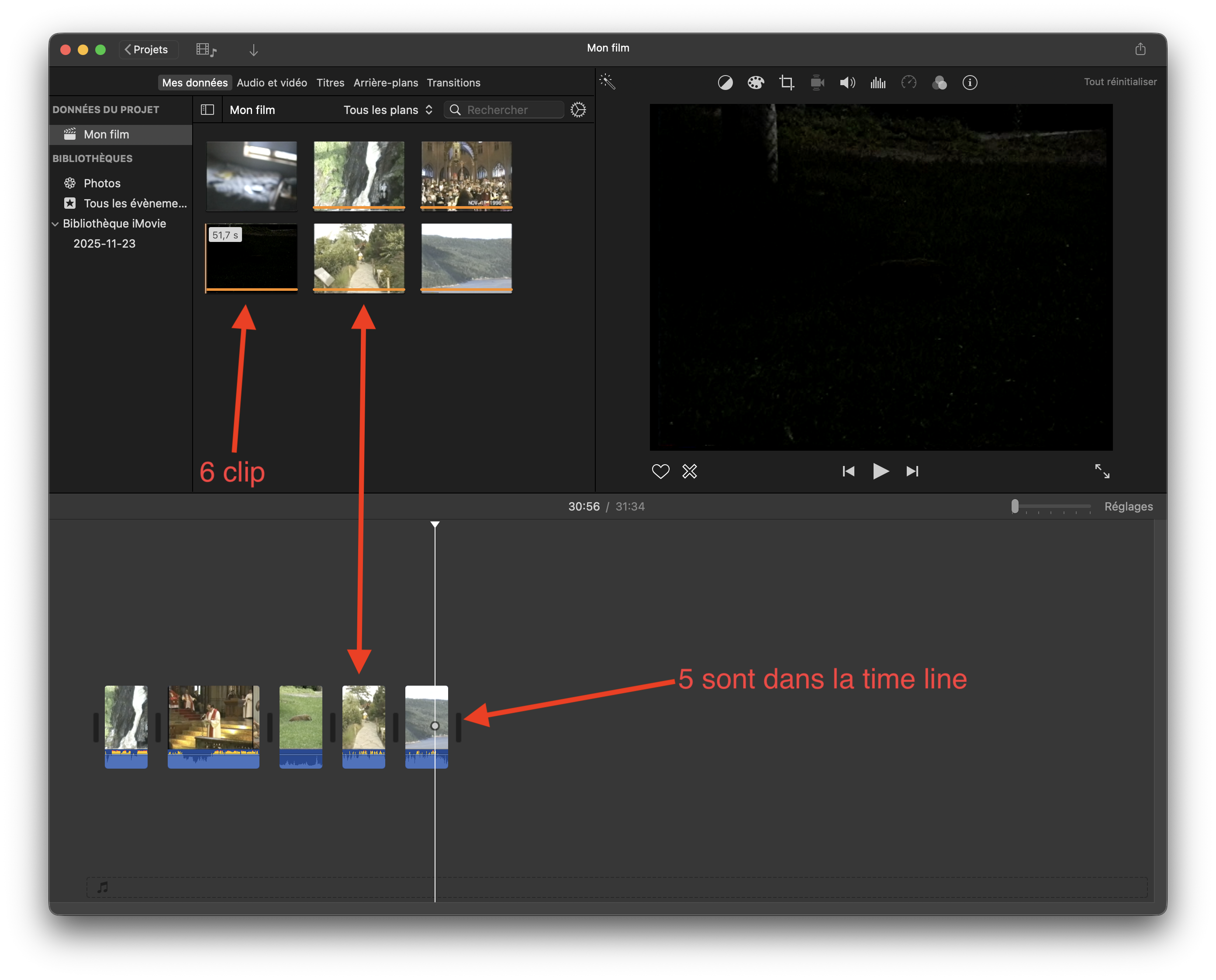 Tout mes éléments de base (vidéos & photos)sont bien dans la bibliothèque iMovie et le déroulement du film se passe sans problème lors du visionnage. Mais impossible de partager pour l'envoyer dans document ou autre destination. J'ai consulté votre service dépannage assistance Apple le 22 novembre 2025 et après plusieurs recherches le sympathique opérateur n'a informé que suite à des mise à jours d'iMovie mon caméscope PANASONIC HDC SD 60 n'est plus compatible. J'ai fais un essais avec un autre film provenant du même caméscope et l'exportation à fonctionné.