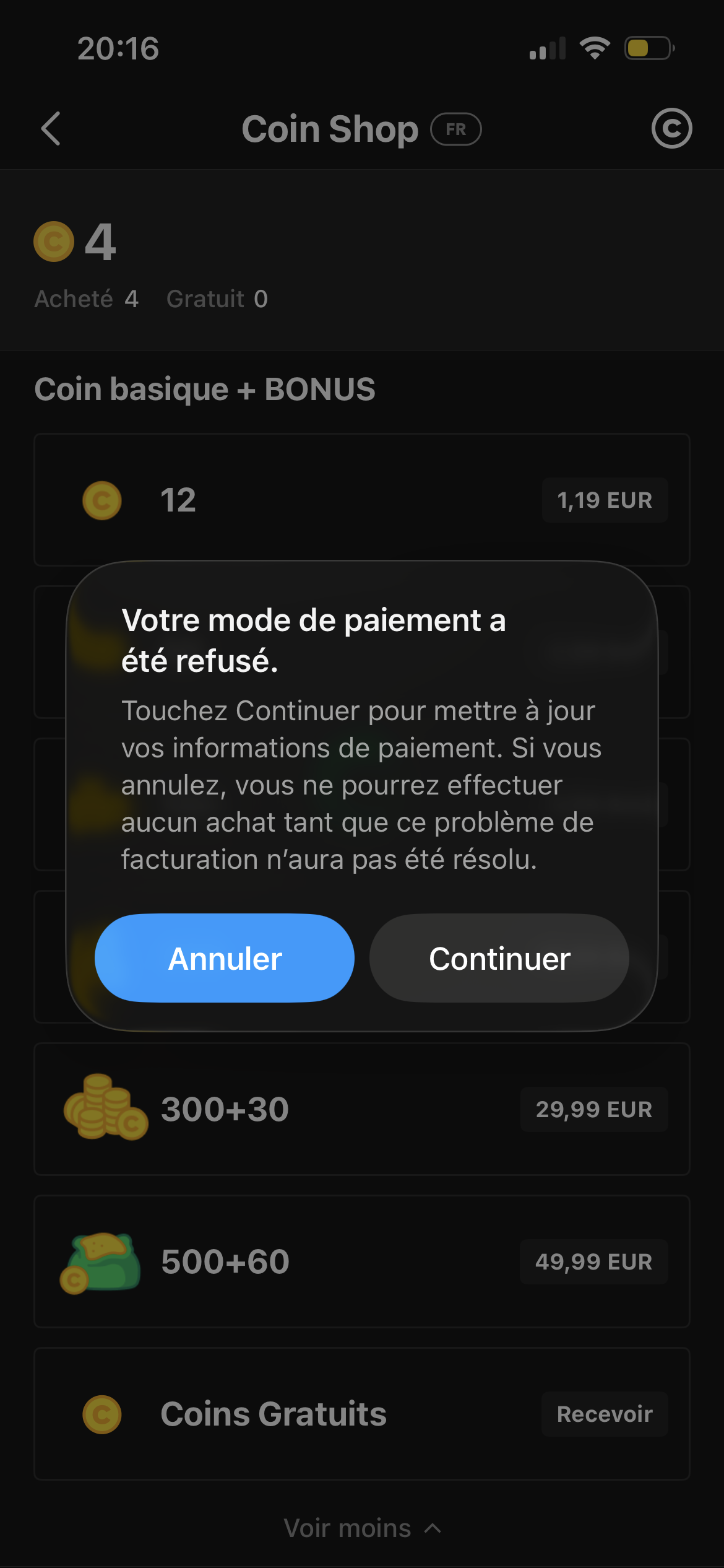 Depuis cette après-midi, lorsque je veux ajouter de l’argent sur mon compte Apple ou lorsque je veux faire un achat intégré sur l’application WEBTOON, j’ai un message qui me dit que mon mode de paiement est refusé. Pourtant ça fonctionne sans problème sur mes autres applications.
