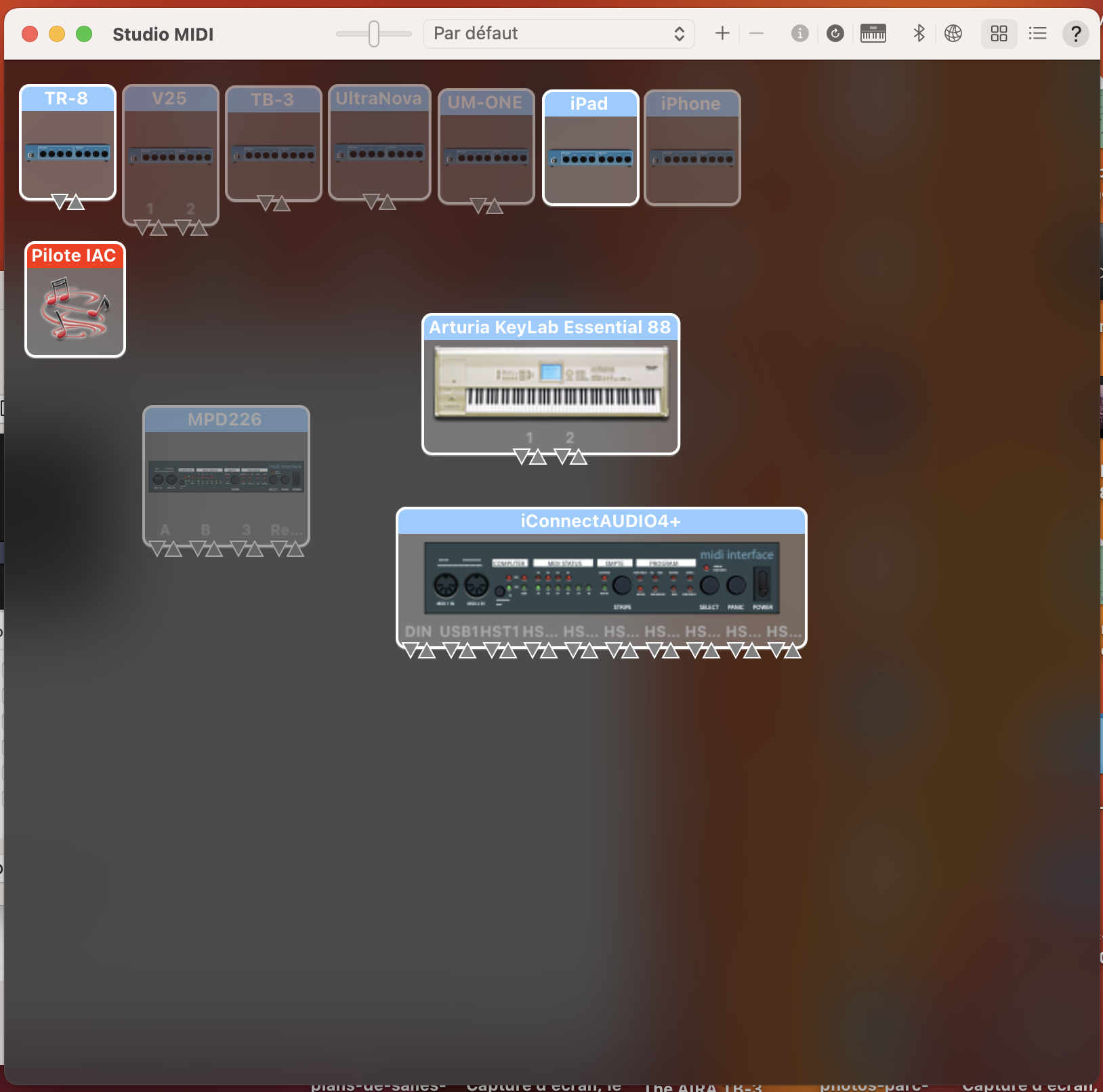 J'ai branché mon iPad Pro 2019 à mon iMac 2017 qui roule avec OS Ventura. Je voulais utiliser un clavier midi branché sur mon iMac pour contrôler et jouer d'un synthétiseur sur mon iPad dans Garage Band pour iOS mais ça ne fonctionne pas. Les deux appareils sont branchés dans le iMac. Je soupçonne qu'il y ait un problème avec OS Ventura et la fonction IDAM. J'ai aussi essayé avec mon iPhone SE 2023 et c'est le même résultat. Si vous avez une solution je suis preneur. Je réussi à contrôler des plugins sur mon ordinateur avec le iPad. Mais c'est dans l'autre sens que ça ne fonctionne pas. Toute aide serait bienvenue.