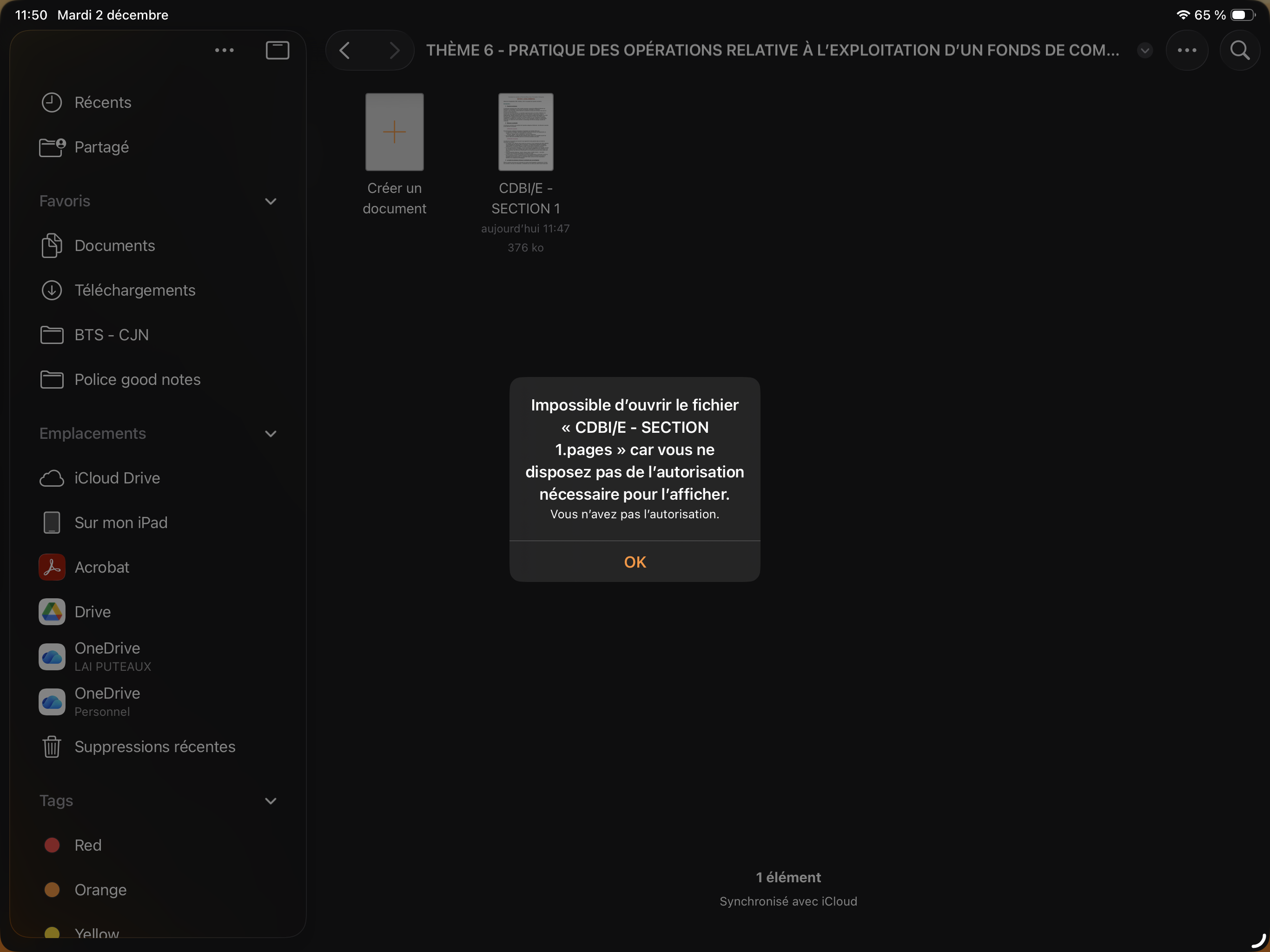 En effet, lorsque je crée un dossier dans Pages ou Fichier dans un dossier déjà créé et qu’ensuite j’y ajoute un document Pages (que je déplace depuis un autre dossier ou que je crée directement dans le dossier) cela m’indique : « Impossible d'ouvrir le fichier «CDBI/E - SECTION 1.pages » car vous ne disposez pas de l'autorisation nécessaire pour l'afficher. Vous n'avez pas l'autorisation. ».