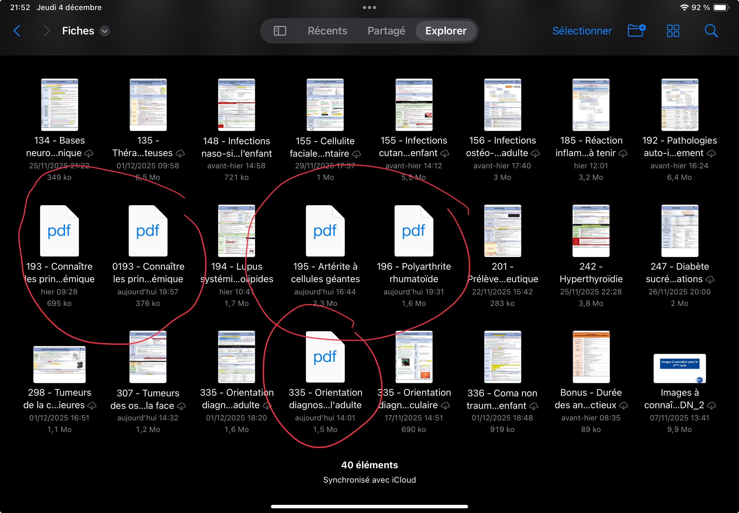 Conseil : Si c'est un problème de synchronisation iCloud (peut-être temporaire selon le réseau), arrêtez d'annoter directement dans le dossier iCloud Drive, essayez plutôt de télécharger vos cours "sur mon iPad", annotez les et ensuite copiez-les sur iCloud.