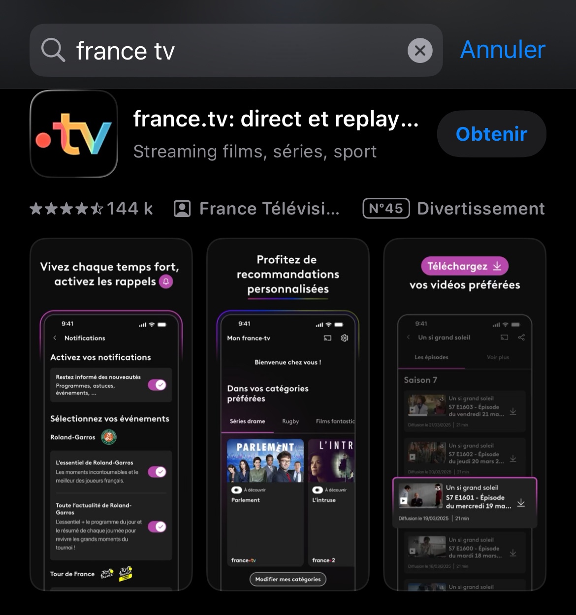 Une autre solution serait d’accéder au site web france.tv et de visionner les vidéo depuis ce site (perso, même en étant en France, c’est ce que je fais 😅 je n’en ai une utilisation vraiment ponctuelle) :