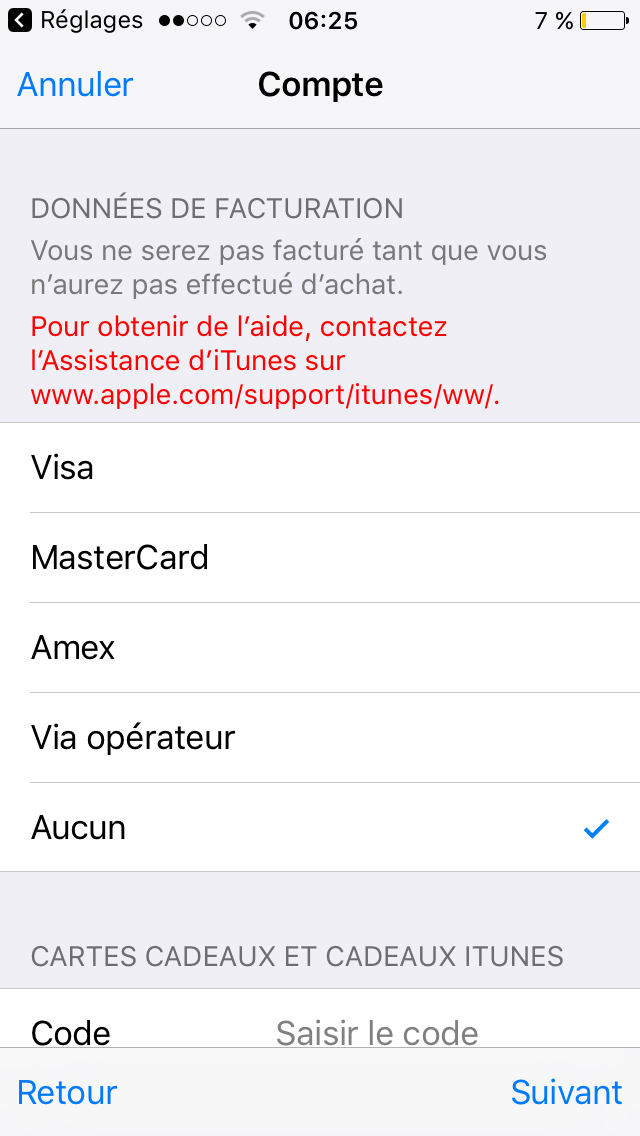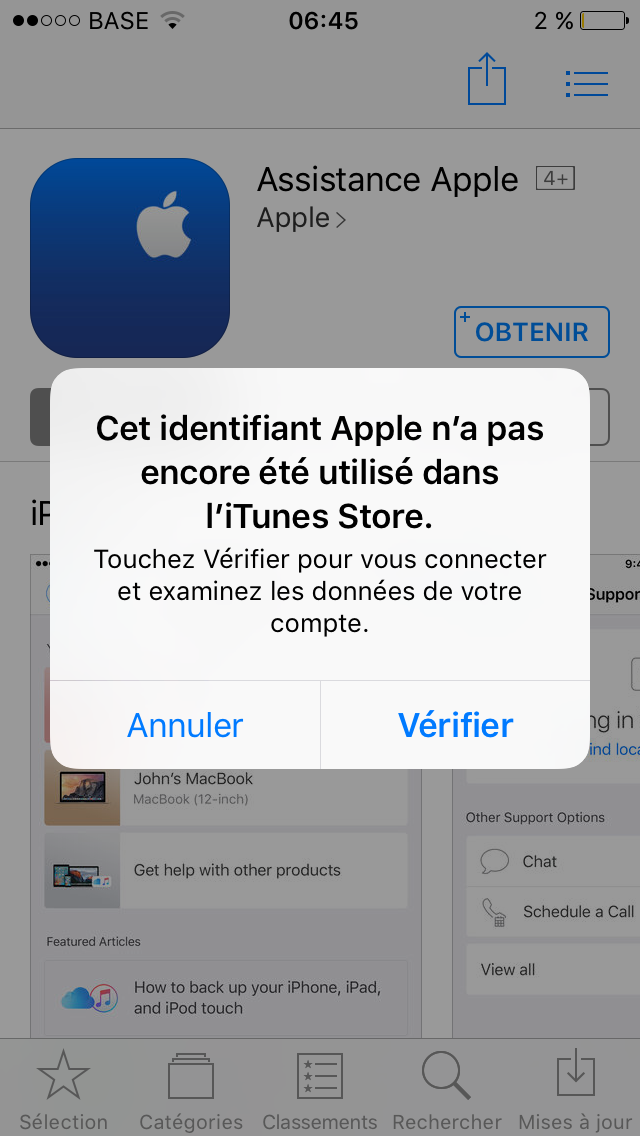 Je n'arrive pas à me connecter à iTunes sur mon iPhone, je reçois ce message "cet identifiant Apple n'a pas encore été utilisé dans l'iTunes Store." Ensuite j'appuie sur "vérifier" on me demande de remplir un formulaire. Le soucis est que malgré que je remplis complètement et correctement le formulaire je n'arrive toujours pas à me connecter, j'ai toujours ce petit message "Pour obtenir de l’aide, contactez l’Assistance d’iTunes sur www.apple.com/support/itunes/ww/.