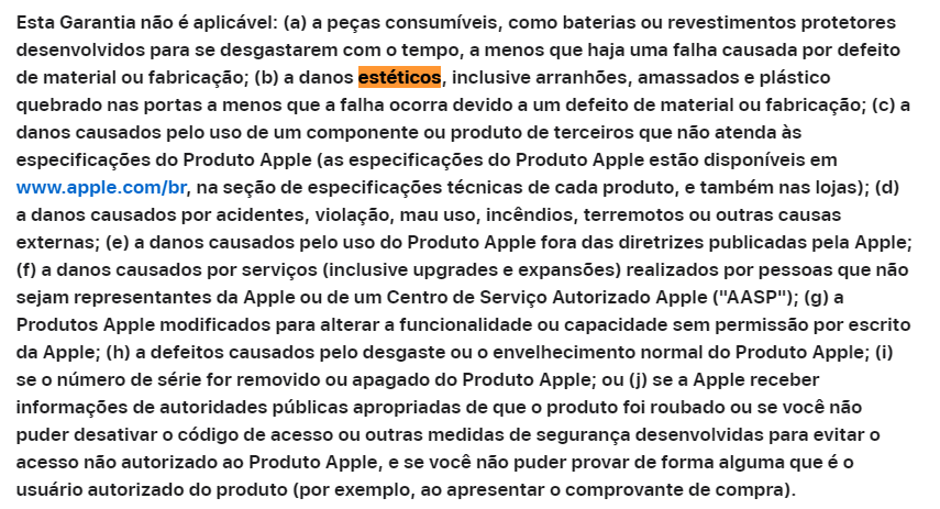Então entendem que é algo que é voltado totalmente a forma que o aparelho é usado e que se trata de algo que não deixa o seu aparelho mais lento, seu aparelho não tira fotos piores por conta disso, o microfone não é afetado, os botões de volume funcionam sem nenhum problema, então isso é um dano totalmente voltado a estética, e você pode checar os termos de garantia da Apple Legal - iOS Warranty Brazilian Portuguese - Apple