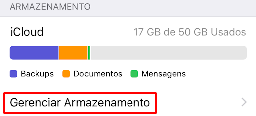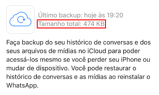 Nesta seção, você verá a quantidade de espaço que o WhatsApp está ocupando na nuvem do iCloud. A quantidade exibida deve corresponder ao valor mostrado nas imagens acima. Se você utiliza tanto o WhatsApp Business quanto o WhatsApp normal, será necessário somar o espaço ocupado por ambos. O valor total dessa soma deve aparecer nas configurações do iCloud.