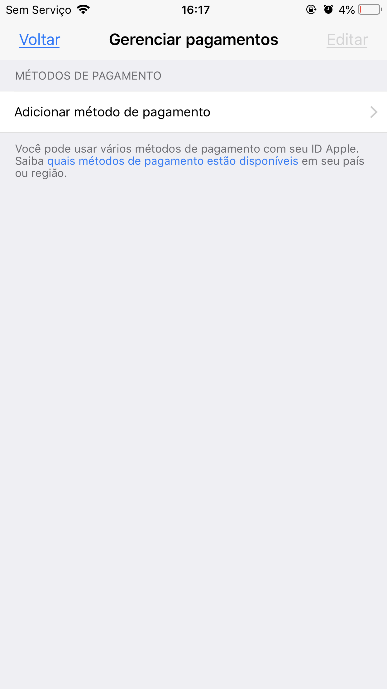 Não estou conseguindo adicionar meu CPF em pagamentos, já segui instruções de outros tópicos de ir em Ajustes > ITunes e App Store > ID apple > ver ID Apple > Gerenciar pagamentos > Adicionar CPF( este campo de adicionar cpf não tem)