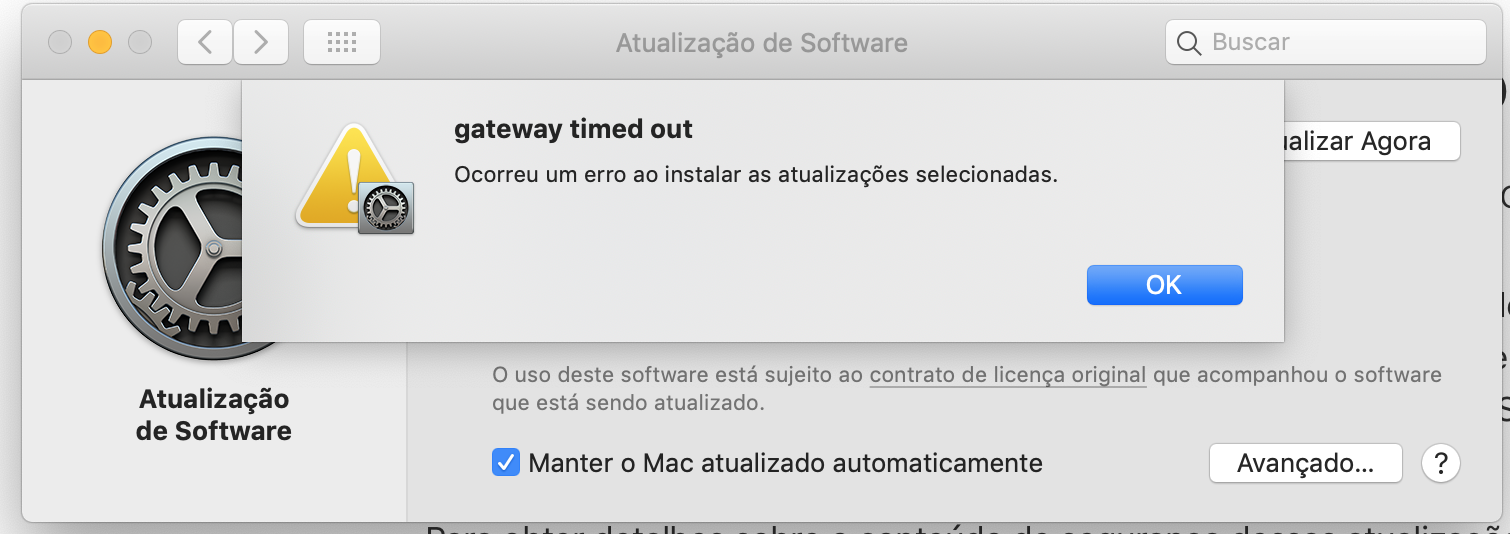 Não consigo fazer a atualização (macOS 10.14.5). o download para em 816,0Mb de 2,48Gb e apresenta a mensagem "Gateway timed out - Ocorreu um erro ao instalar as atualizações selecionadas"