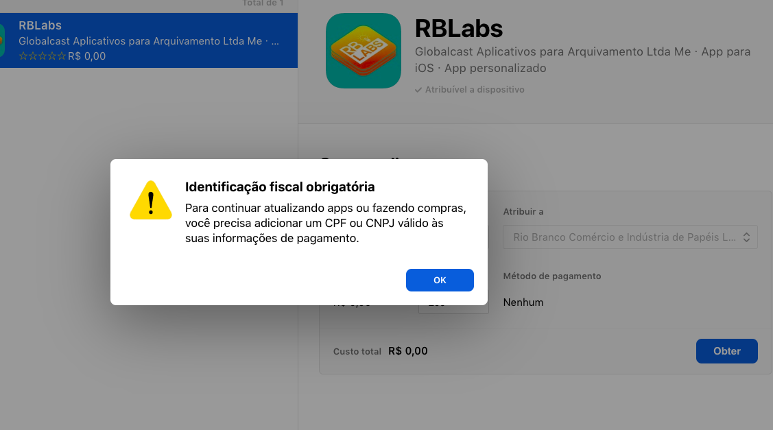 Estou tentando "comprar um app" disponível para minha organização no Apple Business Manager, mas quando clico em comrpar, dá a mensagem abaixo: Identificação Fiscal Obrigatória. Onde coloco isso??