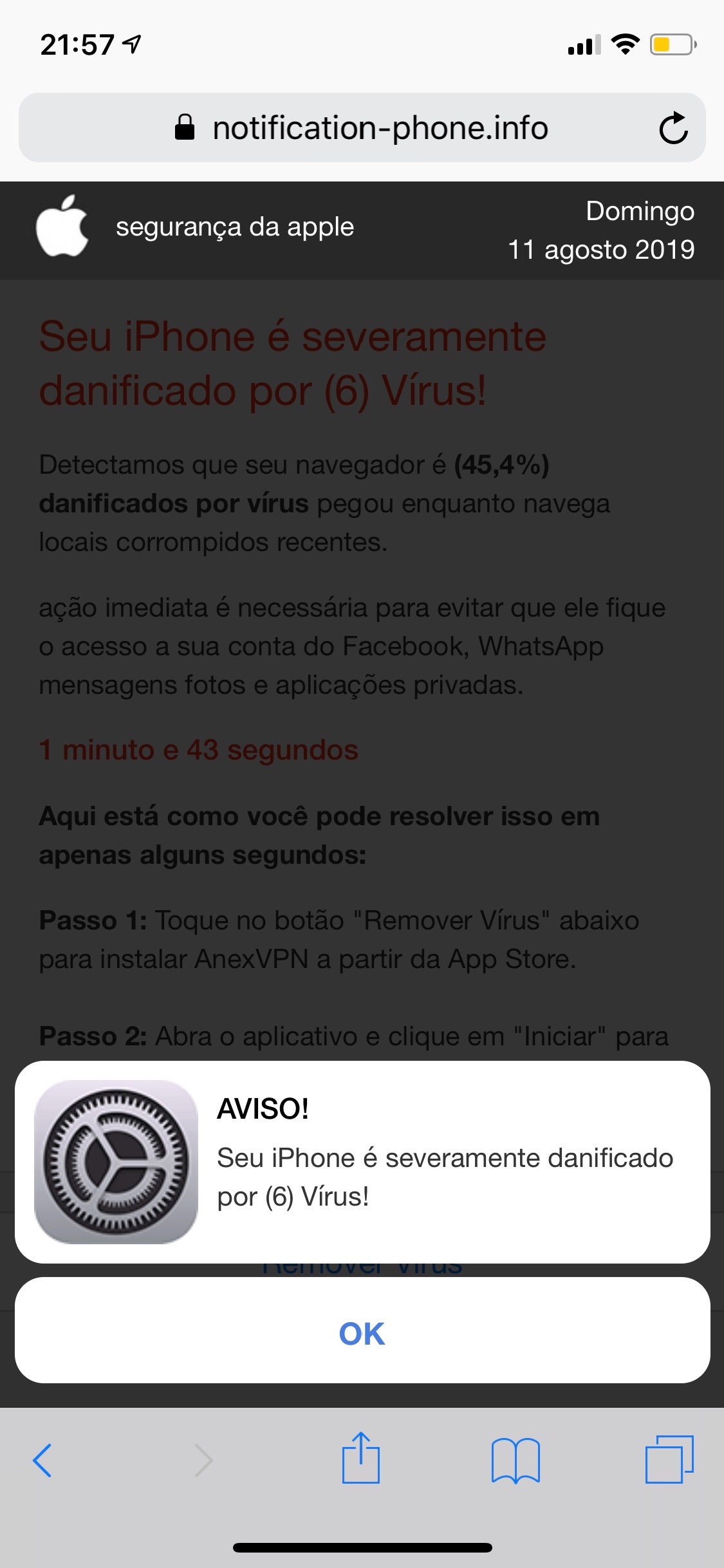 recebi ontem no meu telefone a mensagem de que meu telefone estaria com 45% de vírus e me mandava para um link. Não abri, mas mostrei para o meu marido e ele entrou no link, só que não tinha nada. O iPhone manda esse tipo de msg?