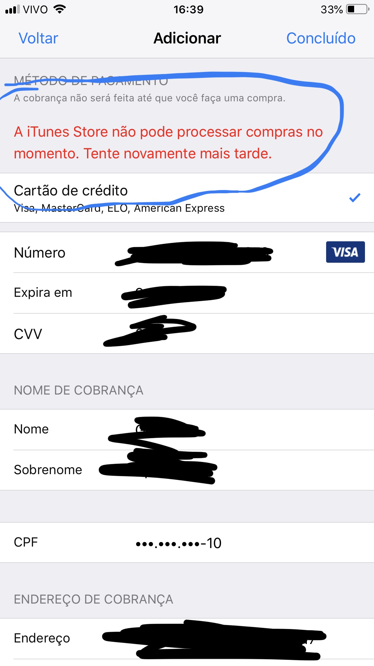 Estou tentando baixar um app gratuito e pede para atulaizar o metodo de pagamento, e quando vou colocar outro cartao aparece: A Itunes Store nao pode processar compras no momento , não sei mais oque fazer pois necessito desse app o mais rapido possível 😡😭