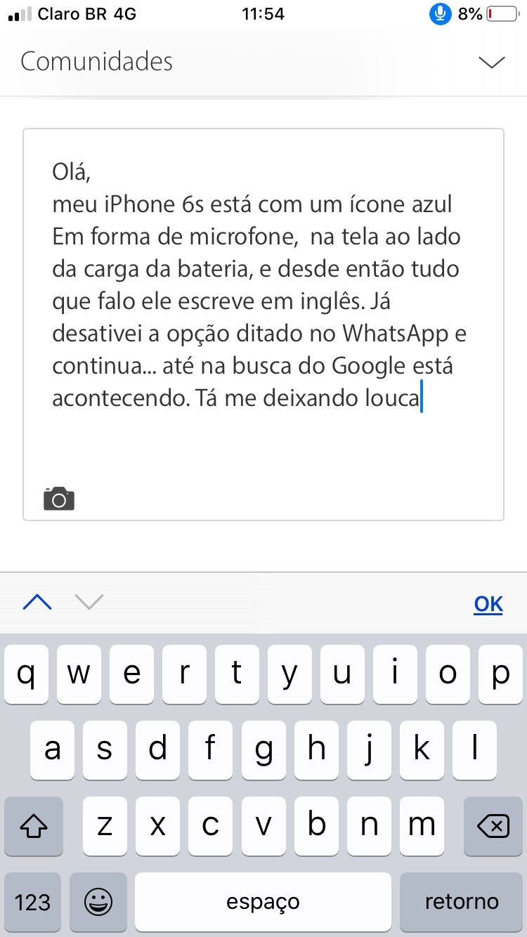 meu iPhone 6s está com um ícone azul Em forma de microfone, na tela ao lado da carga da bateria, e desde então tudo que falo ele escreve em inglês. Já desativei a opção ditado no WhatsApp e continua... até na busca do Google está acontecendo. Tá me deixando louca