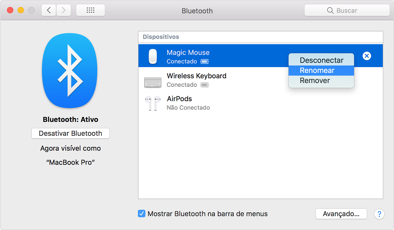 Agora, o nome personalizado que você deu ao acessório será exibido no menu Bluetooth do Mac e na seção Bluetooth das "Preferências do Sistema".*