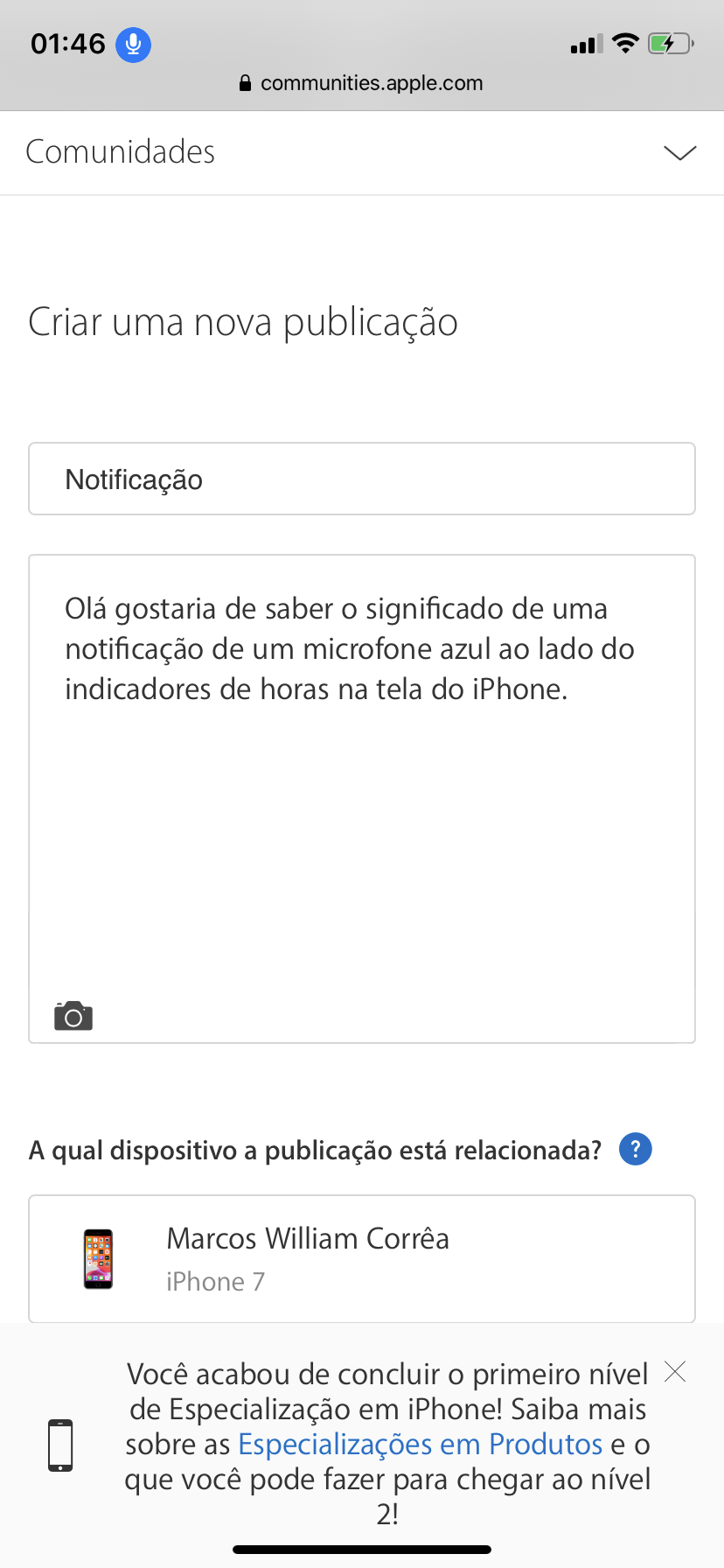 Vejo que vc gostaria de saber o significado de uma notificação de um microfone azul ao lado do indicadores de horas na tela do iPhone.