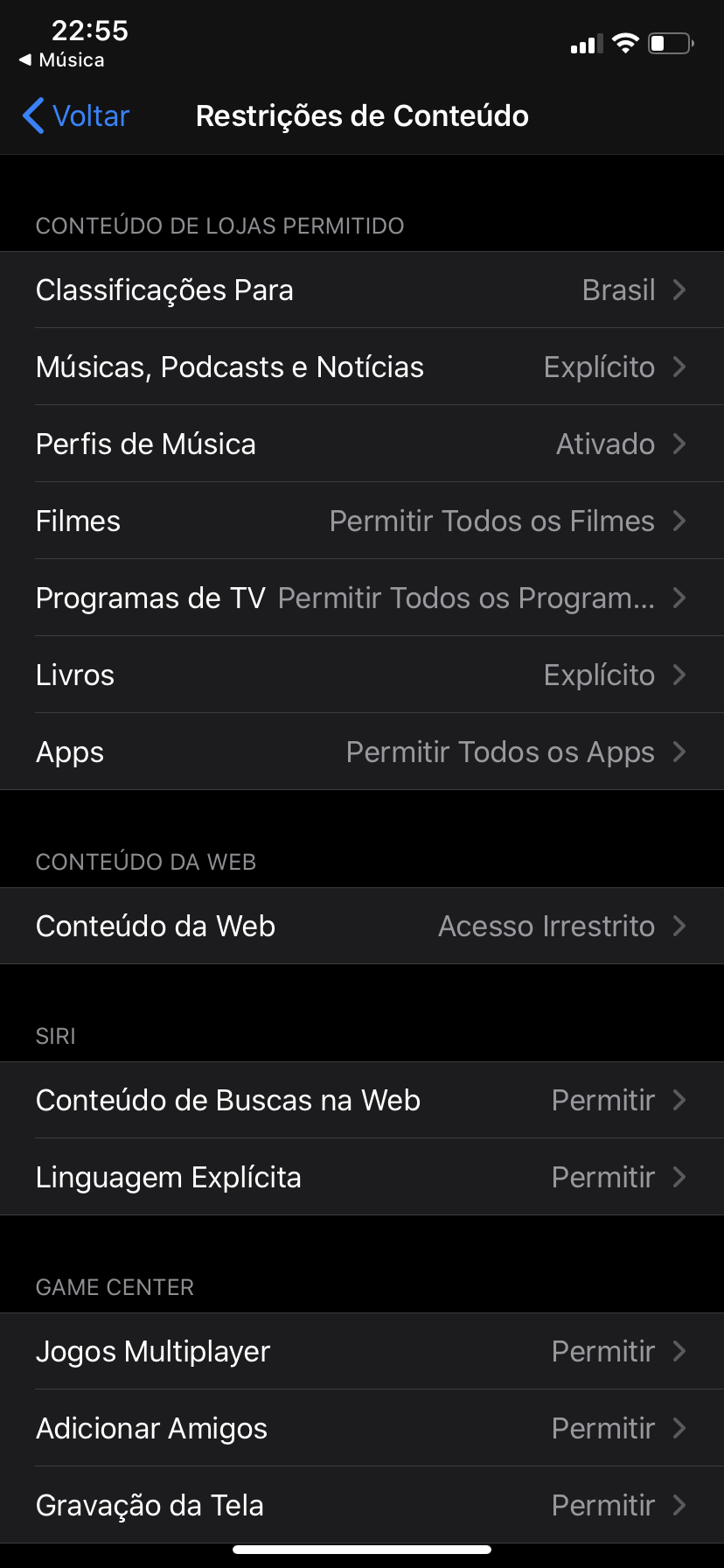 Também é possível impedir a reprodução de músicas com conteúdo explícito, bem como filmes ou programas de TV com classificações de conteúdo específicas. Os apps também têm classificações que podem ser configuradas por meio das restrições de conteúdo.