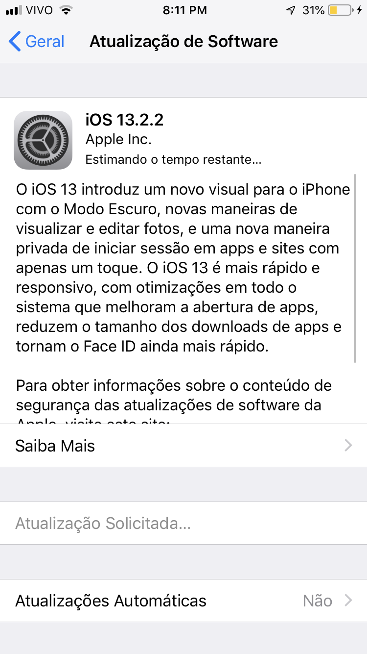Não consigo atualizar o IOS 13.2.2. Fica “estimando o tempo restante” e não conclui o processo.