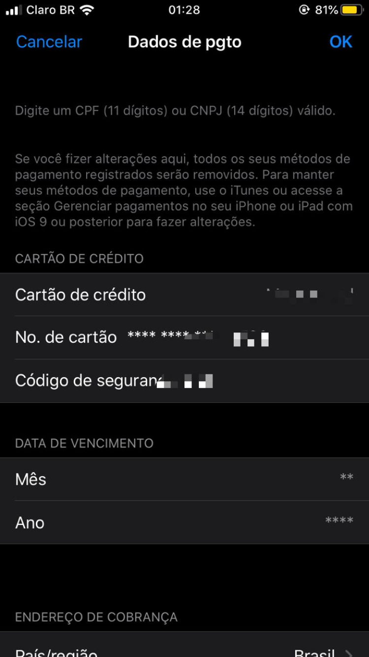 Por que nao consigo colocar o cpf na hora que vou colocar os dados de compra de armazenamento do iCloud?
