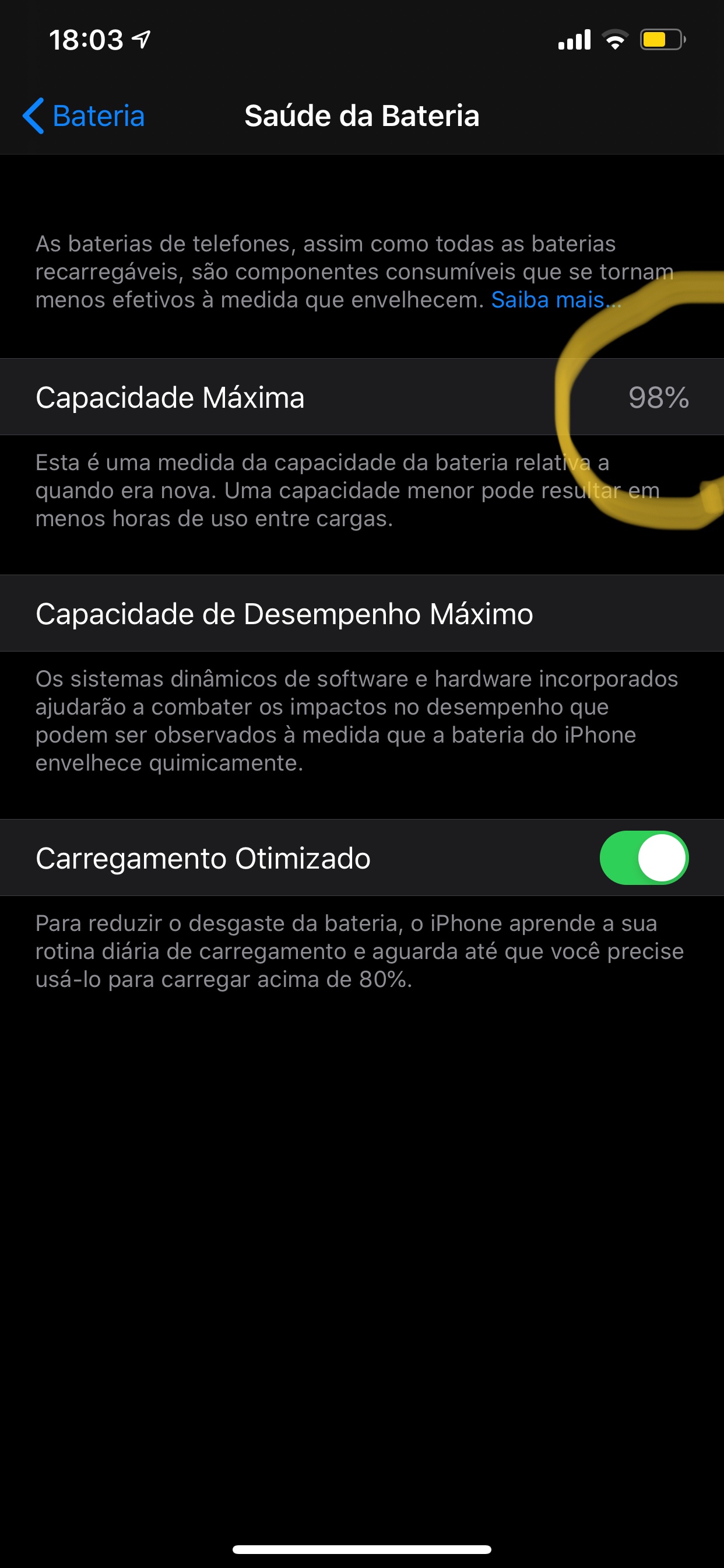 galera adquiri meu iPhone 11 pro Max a menos d 45 dias e hoje fui ver a saúde da bateria 98% como pode eu não acredito nisso quase não utilizo o aparelho e como pode 98% d saúde da bAteria vi vários relatos não sou o único se mais algm tiver uma informação sobre o acontecimento mede um sinal pois eu não acredito q esteja acontecendo com um aparelho tão caro espero tbm uma posição não só a minha pessoa mais a todos usuários dos iPhones 11 pq é d fica chateado com isso tato_treking