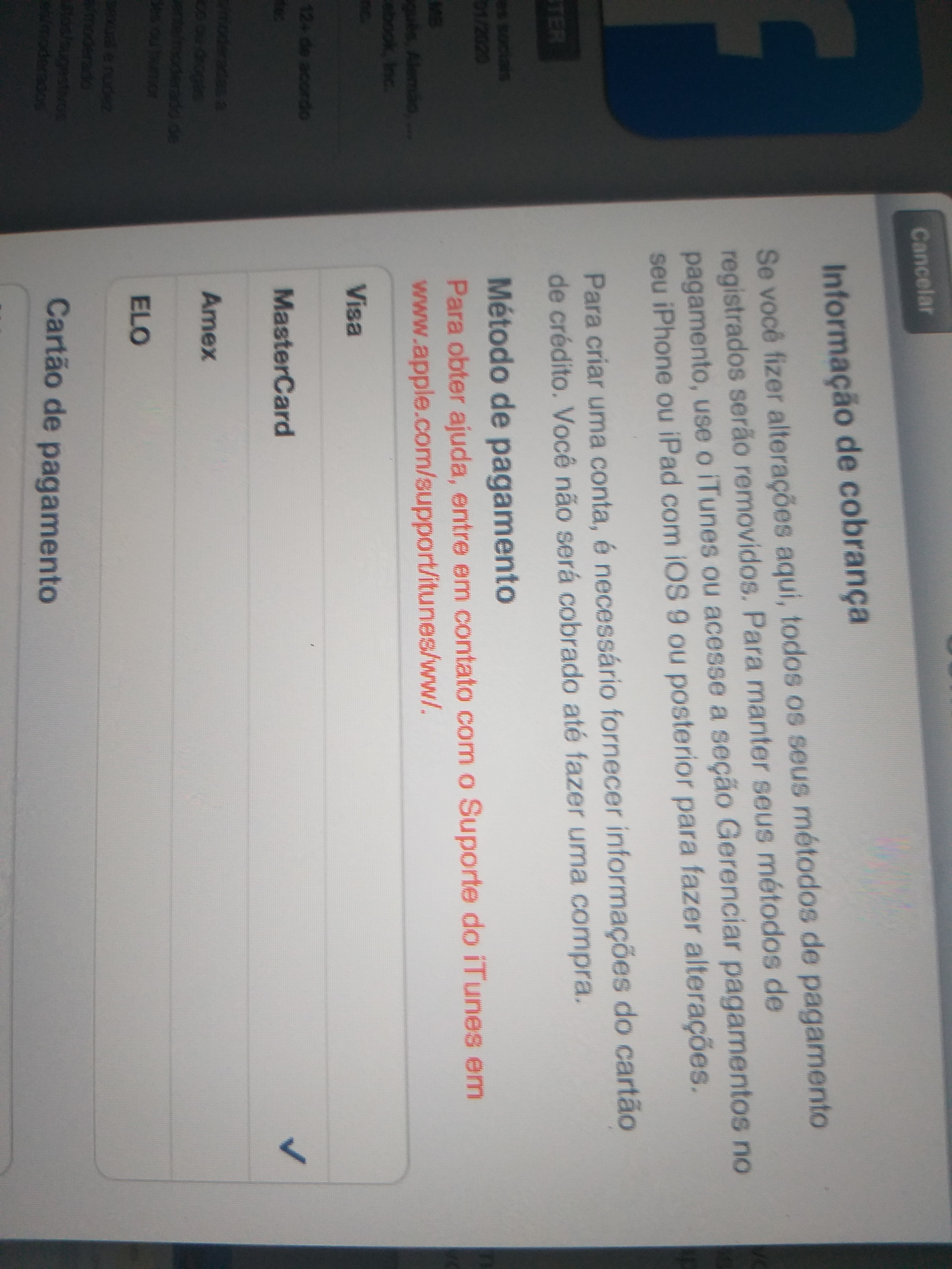 Quando vou baixar algo na App store, pede para revisar minha conta no Itunes, quando faço isso, ela pede dados do meu cartão de credito e tals, concluindo o cadastro, quando quero prosseguir daquela pagina, não aparece erro, mas informa para entrar em contato com apple.com/support, e não consigo sair mais daquela pagina,