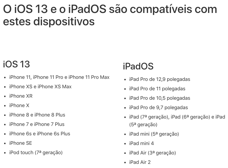 O iOS 13 e o iPadOS são compatíveis com estes dispositivos - Suporte da Apple