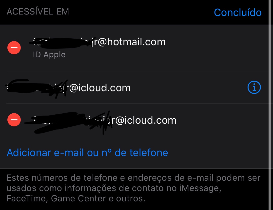 Seguinte, quando eu entro no iPhone em "Ajustes", e no meu Apple ID, depois "Nome, Telefones, Email", na aba de "Acessível Em" aparecem 3 emails: o meu principal que é @hotmail.com e dois alias @iclould.com. Porém eu consigo apagar um alias só, no outro aparece "Não é possível remover seu endereço de email. Use os ajustes do iMessage e do Facetime".