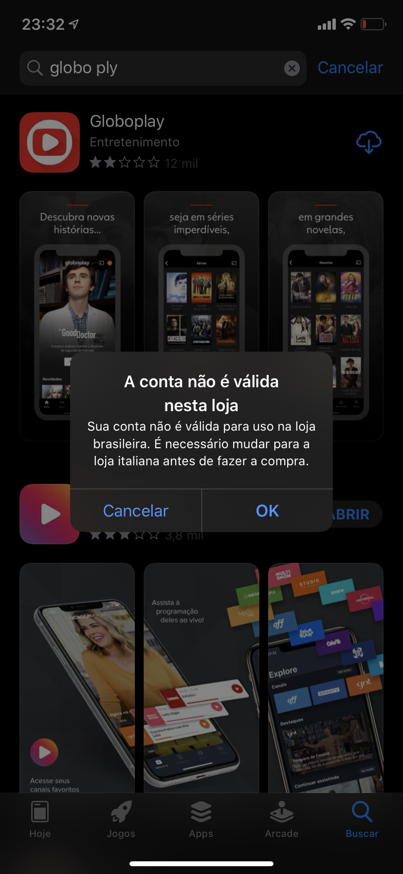 Comprei meu celular na Itália. Agora que estou no Brasil já mudei a região para Brasil, inclusive a da App Store com o novo cartão brasileiro. Tentei baixar o app da GloboPlay e diz: “A conta não é válida nesta loja. Sua conta não é válida para uso na loja brasileira. É necessário mudar para a loja italiana antes de fazer a compra”. Como eu poderia proceder? Antes, quando meu celular estava com a região da Itália, o app nem mesmo aparecia. Obrigado.