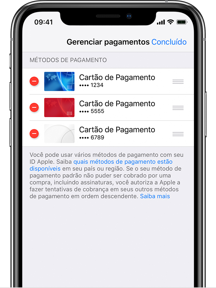 para reorganizar os métodos de pagamento. A Apple tentará fazer cobranças de acordo com a ordem dos métodos de pagamento, de cima para baixo. Você não pode alterar a ordem de cobrança do saldo do ID Apple.