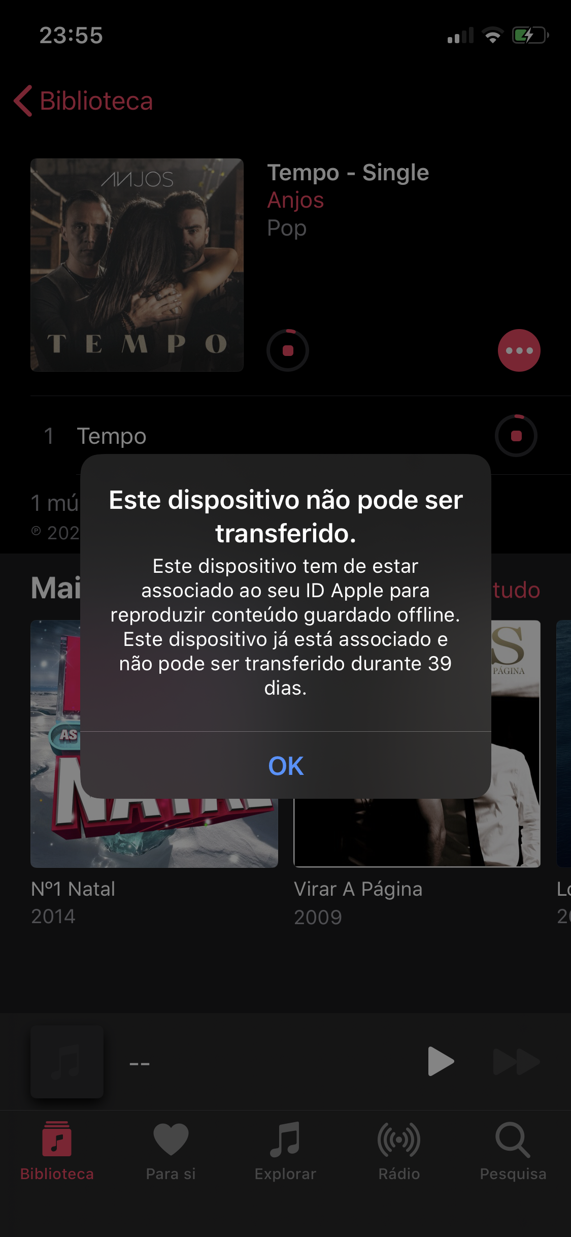 Boa noite, mudei de aparelho móvel - iPhone 7 Plus para o iPhone X - desde q adquiri o X q a minha conta no Apple Music reporta uma mensagem que só posso utilizar em modo offline daqui a x tempo ... neste caso 39 dias! não consigo baixar músicas! Alguém me consegue elucidar pff